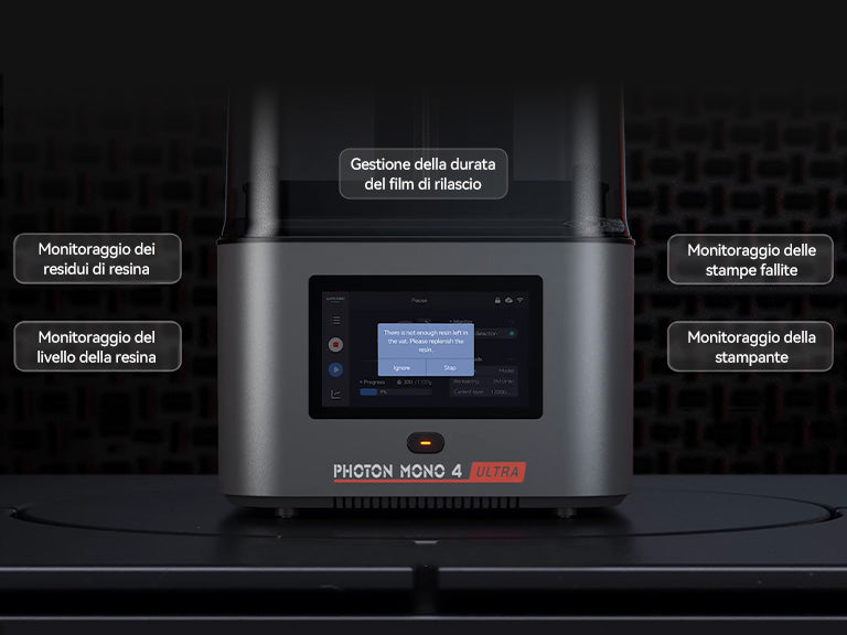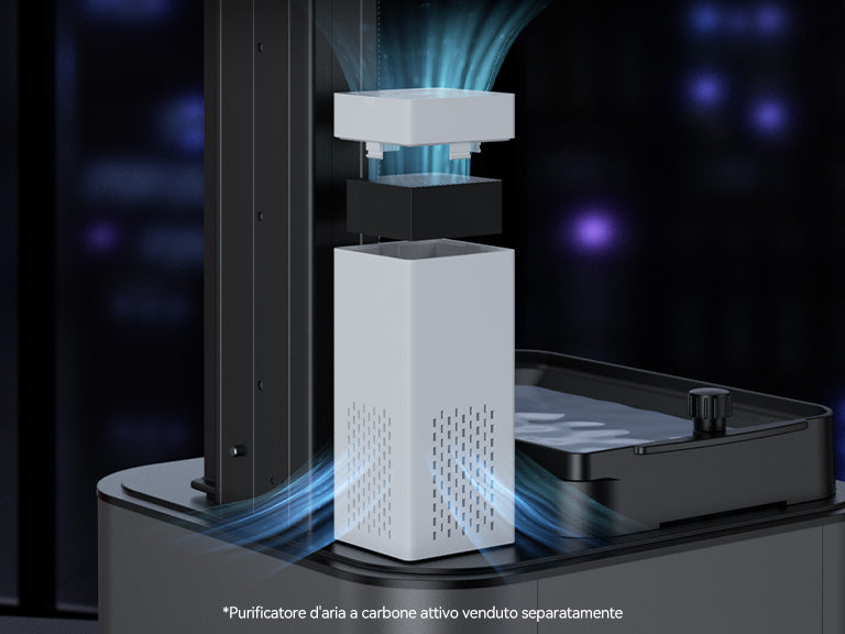 - Il filtro in carbonio attivato ad alta densità da 18 mm, del peso di 17 grammi, è progettato per catturare e neutralizzare in modo efficiente le molecole di odore prodotte durante la stampa.
