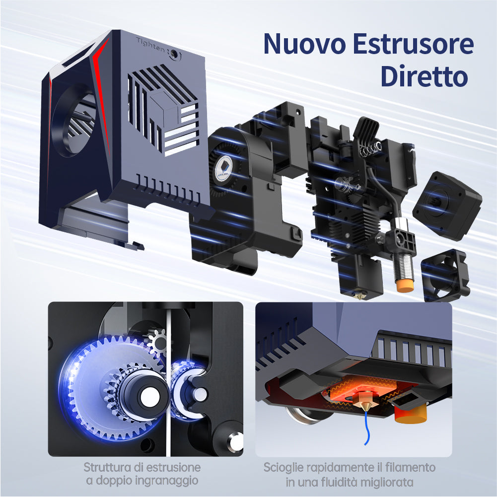 La potenza dell'estrusore aggiornato raggiunge i 60 watt, scioglie rapidamente il filamento migliorandone la fluidità del flusso; la struttura di estrusione a doppia ingranatura controlla accuratamente la consegna del materiale.