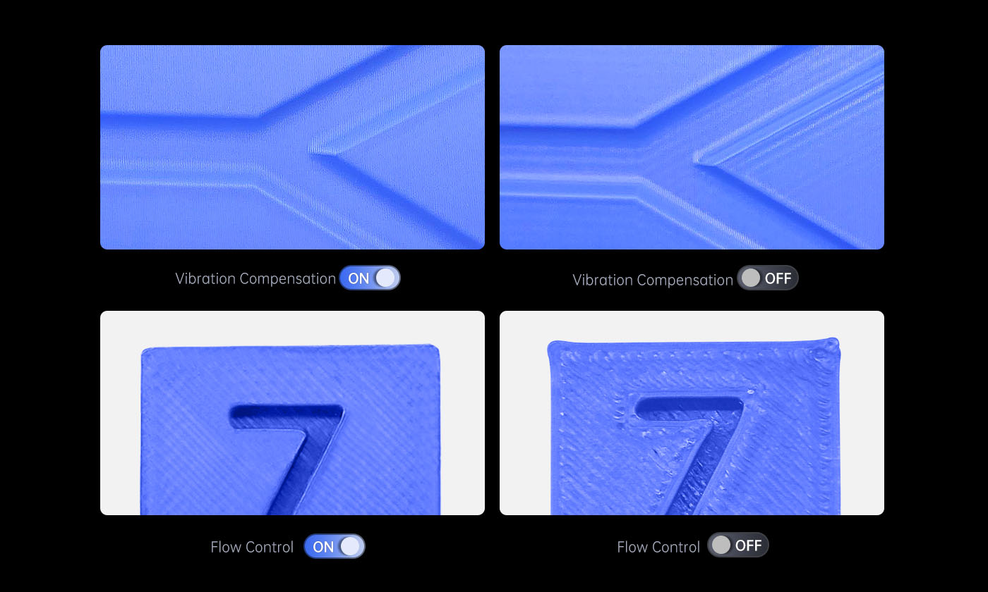 Con la "Compensazione delle vibrazioni", attivabile con un solo clic, il rilevamento della frequenza di risonanza sull'asse X/Y elimina le linee verticali e di staffa per garantire la stabilità della stampa. Il controllo del flusso migliora la qualità dello strato grazie alla compensazione intelligente della ritrazione e del riempimento, garantendo risultati uniformi e dettagliati.