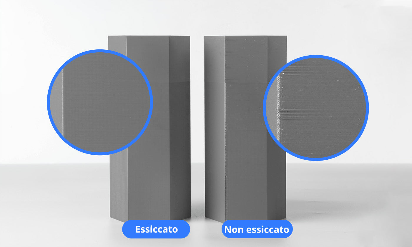 I filamenti PETG devono essere asciugati prima della stampa e conservati in un ambiente a umidità controllata per evitare la formazione di bolle d’aria durante la stampa.
