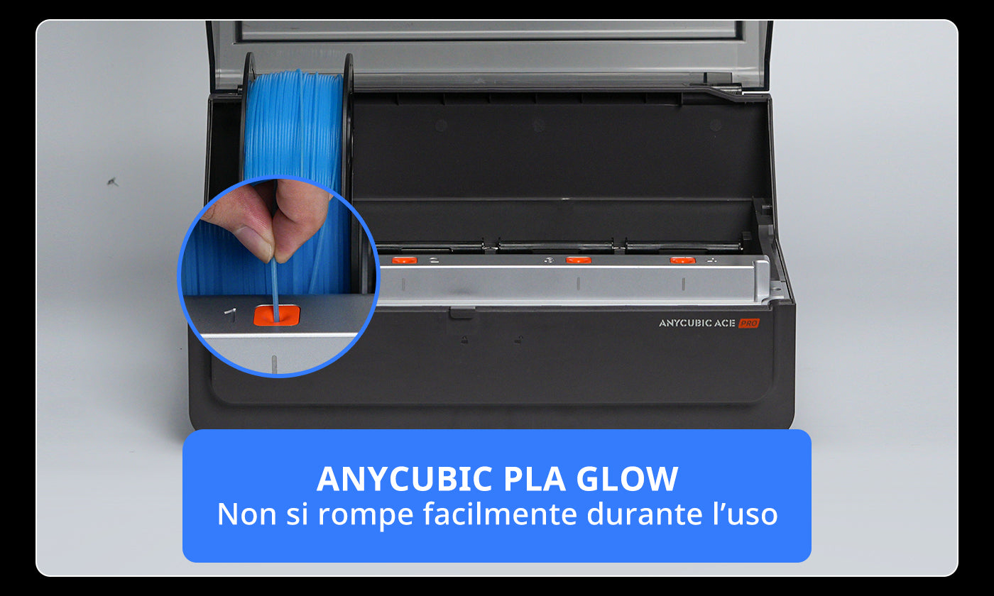 L’Anycubic PLA Glow è progettato per durare, offrendo un’eccellente resistenza alla flessione e allo strappo. Abbinato alla scatola per filamenti ACE Pro, garantisce un’esperienza di stampa impeccabile e priva di intasamenti ogni volta.